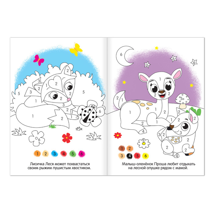 На каждой странице — отдельный сюжет, небольшой стишок и обозначения, какие цвета использовать.