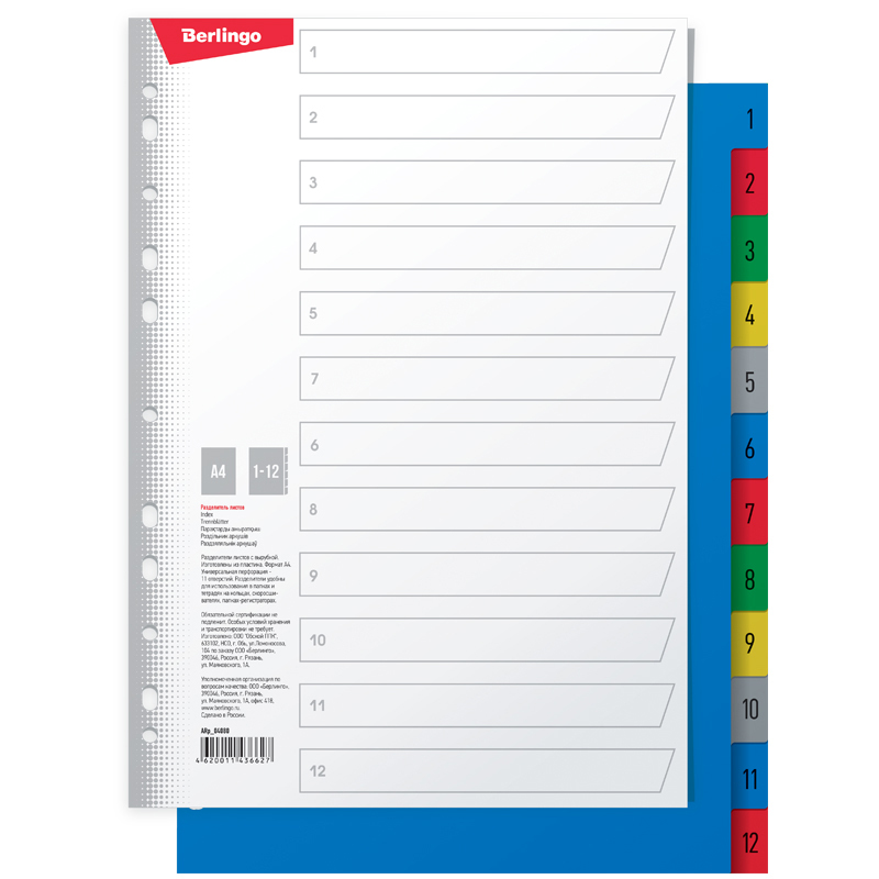 Разделители пластиковые, формат А4. Обеспечивают сохранность и аккуратность листов. Удобны в использовании с папками-регистраторами и папками на кольцах. Индивидуальная упаковка в плёнку, затем в гофрокороб.