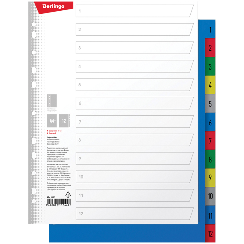 Разделитель листов Berlingo А4+, 12 листов, цифровой 1-12, цветной, пластиковый И