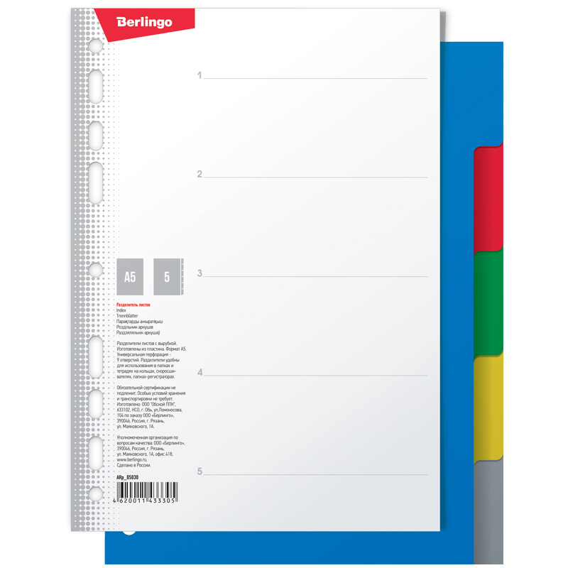 Разделитель листов Berlingo А5, 5 листов, без индексации, цветной, пластиковый ARp_05030 И