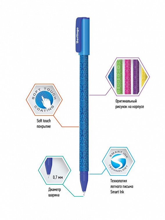 Ручка шариковая Berlingo Funline "Ornament", 0,7мм, с рисунком на корпусе. Технология Smart Ink обеспечивает супермягкое письмо. Приятное бархатистое покрытие корпуса создает дополнительный комфорт при письме. Цвета корпуса ассорти. Диаметр пишущего узла - 0,7 мм. Цвет чернил - синий.