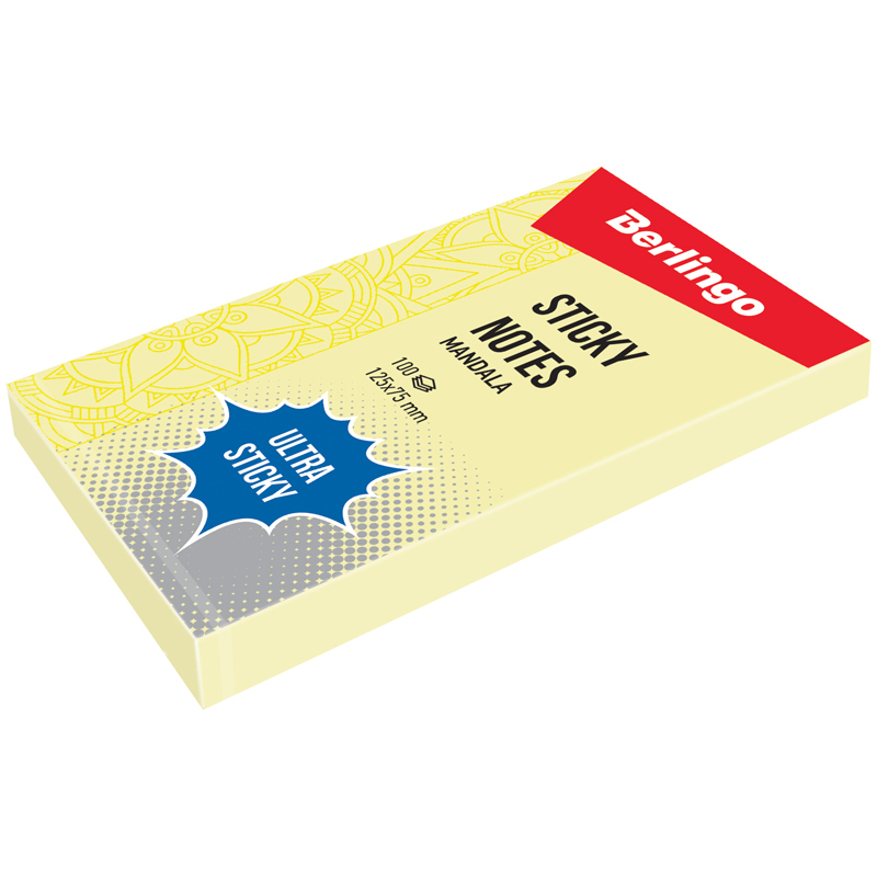 Блок самоклеящейся бумаги для заметок Berlingo "Ultra Sticky" размером 125*75 мм и повышенной клейкостью 25 Н/м. Боковой декоративный орнамент-мандала, можно использовать в качестве антистресс-раскраски. Изготовлен из бумаги плотностью 75 г/м2. Праймер слой, удерживающий клей при переклеивании, позволяет не оставлять следов на поверхности и многократно использовать лист. Специальное покрытие, предотвращающее закручивание, оптимизированное для комфортного письма. Идеальны для наклеивания на различные типы поверхностей. Упаковка 100 листов, цвет - желтый. Упаковка в прозрачную пленку с возможностью быстрого открытия. Производство - Германия.