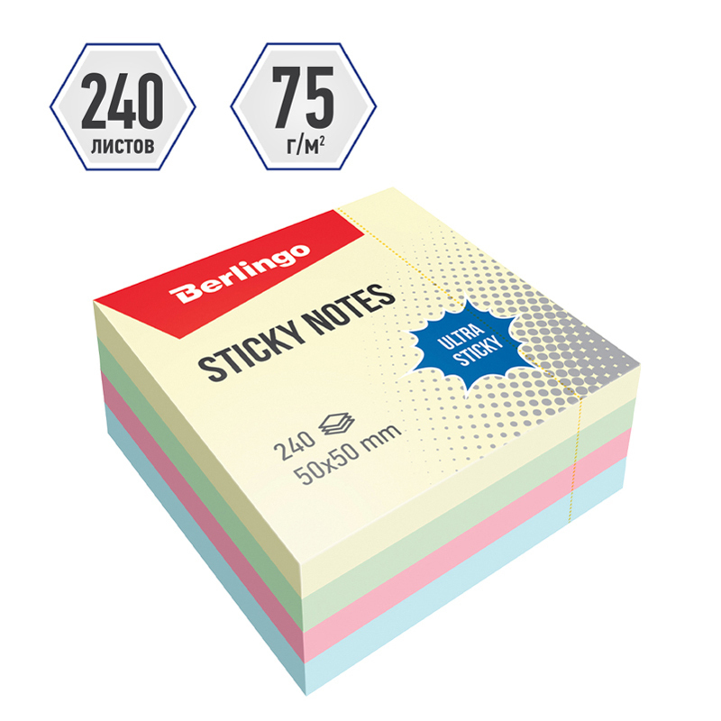 Блок самоклеящейся бумаги для заметок Berlingo "Ultra Sticky" размером 50*50 мм и повышенной клейкостью 25 Н/м. Изготовлен из бумаги плотностью 75 г/м2. Праймер слой, удерживающий клей при переклеивании, позволяет не оставлять следов на поверхности и многократно использовать лист. Специальное покрытие, предотвращающее закручивание, оптимизированное для комфортного письма. Идеальны для наклеивания на различные типы поверхностей. Упаковка 240 листов, 4 пастельных цвета по 60л каждый: зеленый, желтый, розовый, голубой. Упаковка в прозрачную пленку с возможностью быстрого открытия. Производство - Германия.
