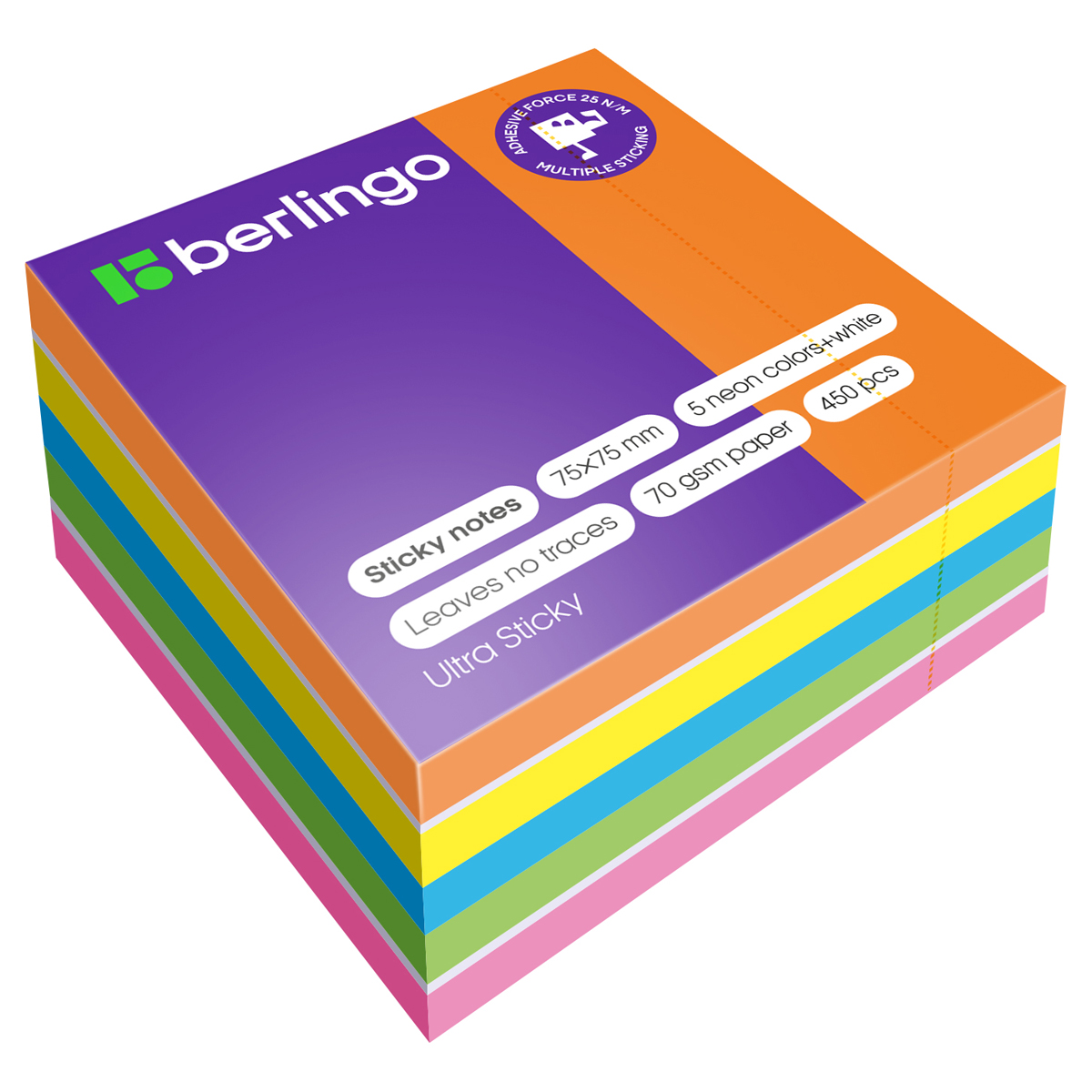 Блок самоклеящейся бумаги для заметок размером 75*75 мм и повышенной клейкостью 25 Н/м. Изготовлен из бумаги плотностью 75 г/м2. Праймер слой, удерживающий клей при переклеивании, позволяет не оставлять следов на поверхности и многократно использовать лист. Специальное покрытие, предотвращающее закручивание, оптимизированное для комфортного письма. Идеальны для наклеивания на различные типы поверхностей. Упаковка 450 листов, 5 неоновых цветов и белый в красивом миксе. Упаковка в прозрачную пленку с возможностью быстрого открытия. Производство - Германия.