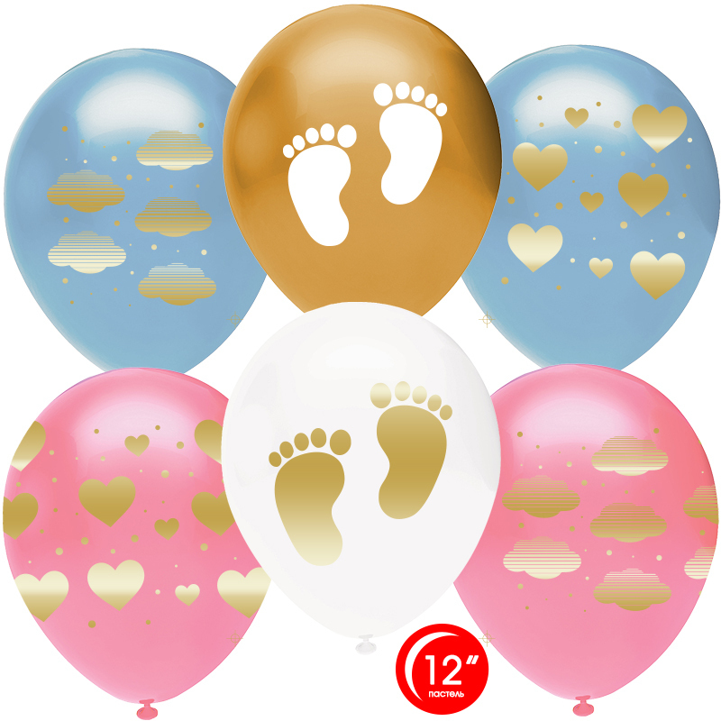 Шар (12''/30 см) Новорожденный (сердца и облака), Ассорти, металлик