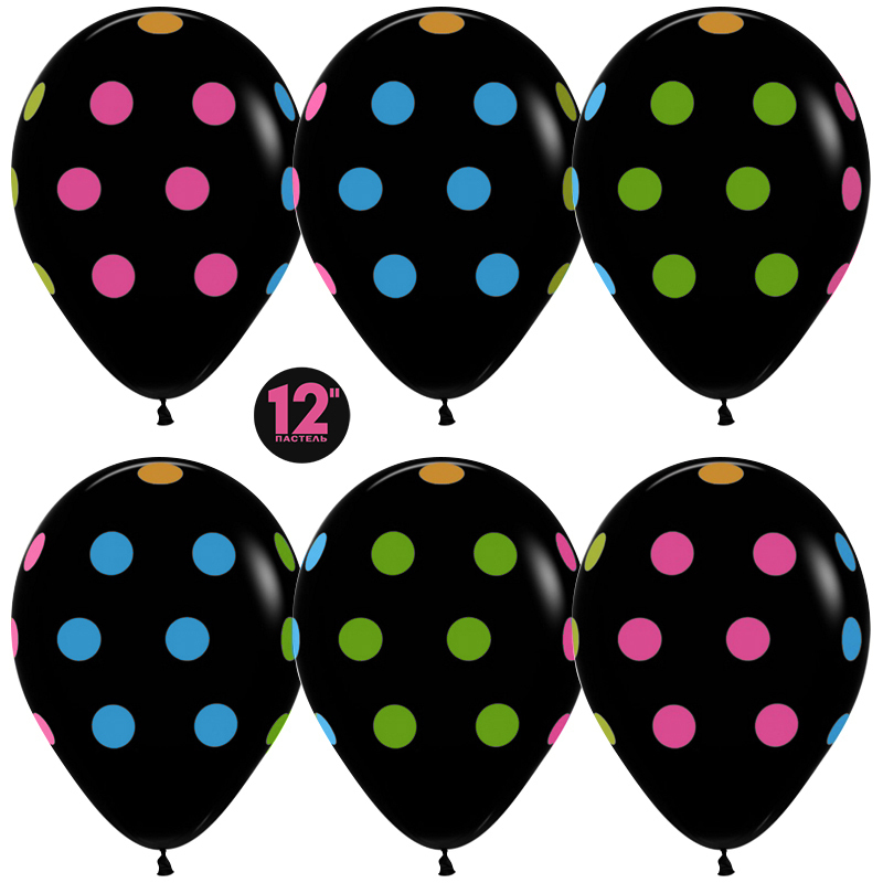 Шар (12''/30 см) Разноцветные точки, Черный (080), неон