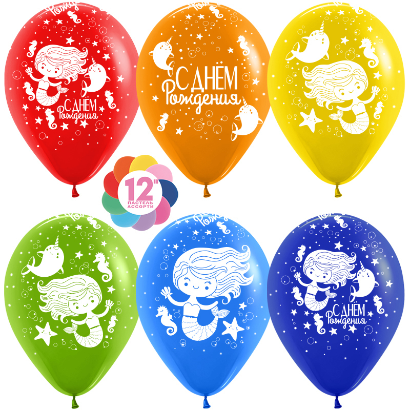 Шар (12''/30 см) Русалочка и нарвал, С Днем Рождения!, Ассорти, пастель