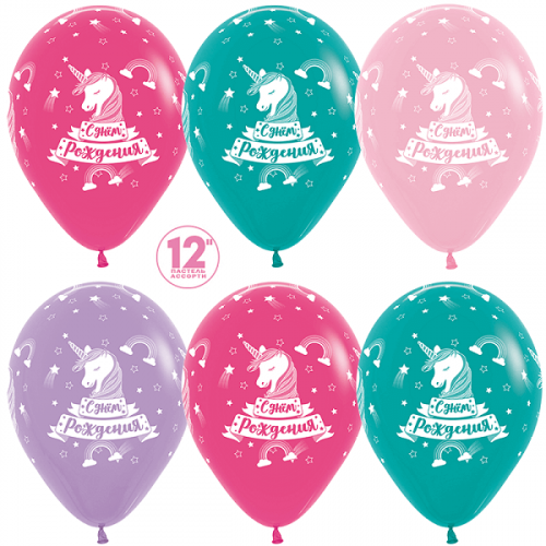 Шар (12''/30 см) С Днем Рождения! (единорог), Ассорти, пастель