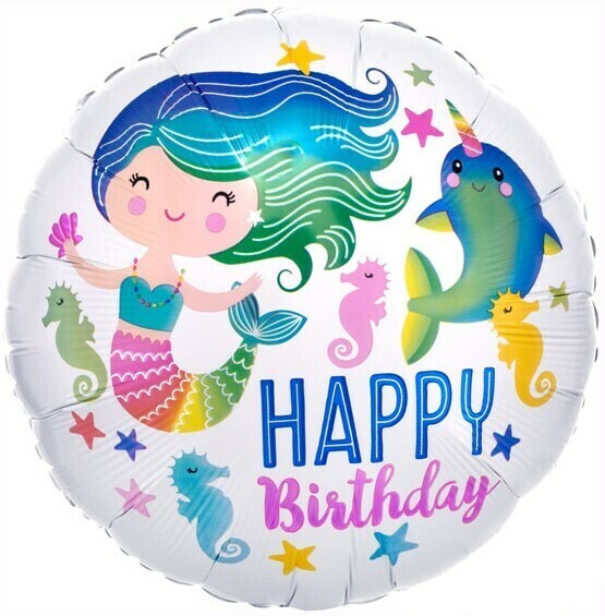 Шар (18''/46 см) Круг, Русалочка и нарвал, С Днем Рождения!, Белый, 1 шт.