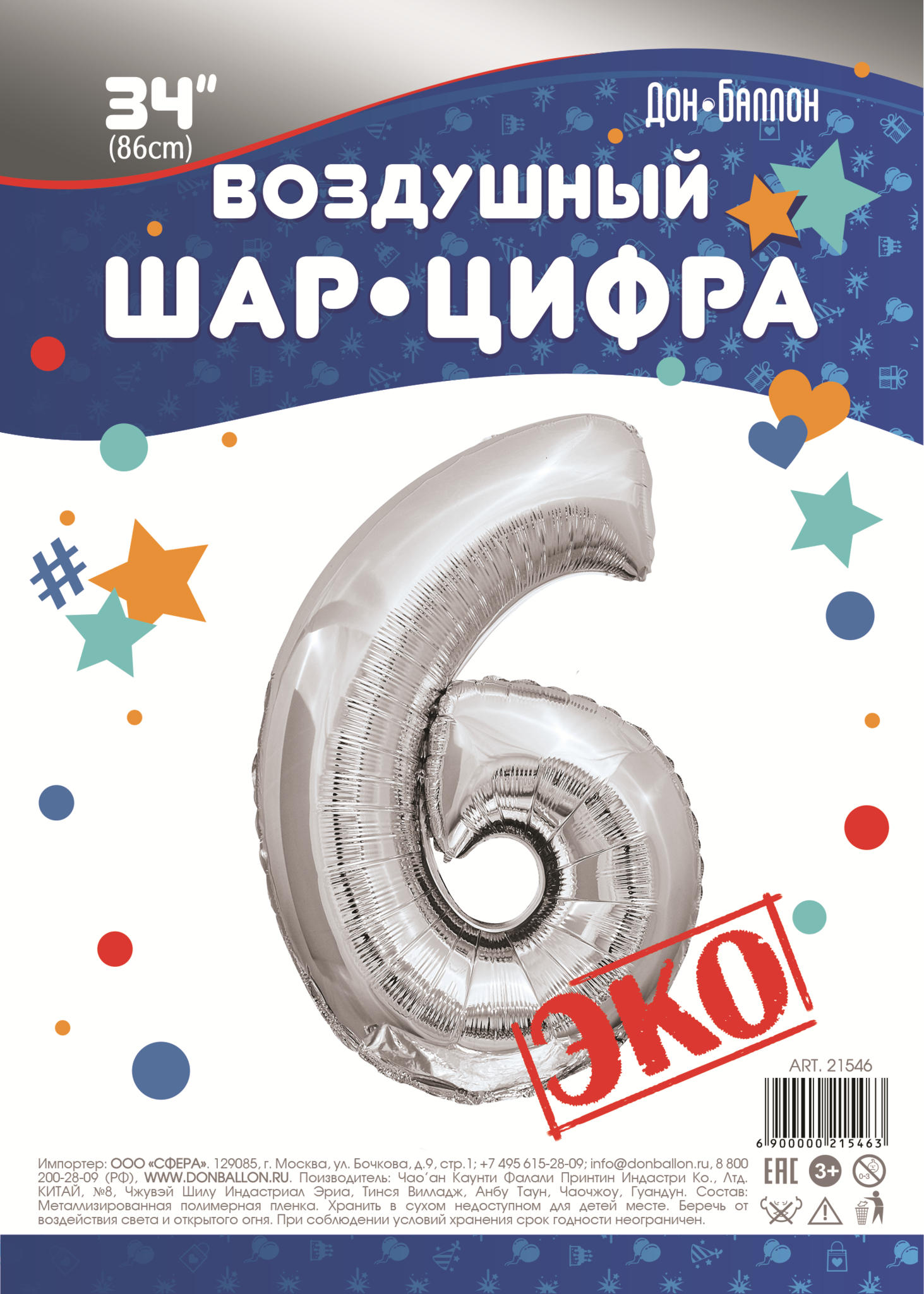 Шар (34''/86 см) Цифра, 6 ЭКО, Серебро, 1 шт. в упак.