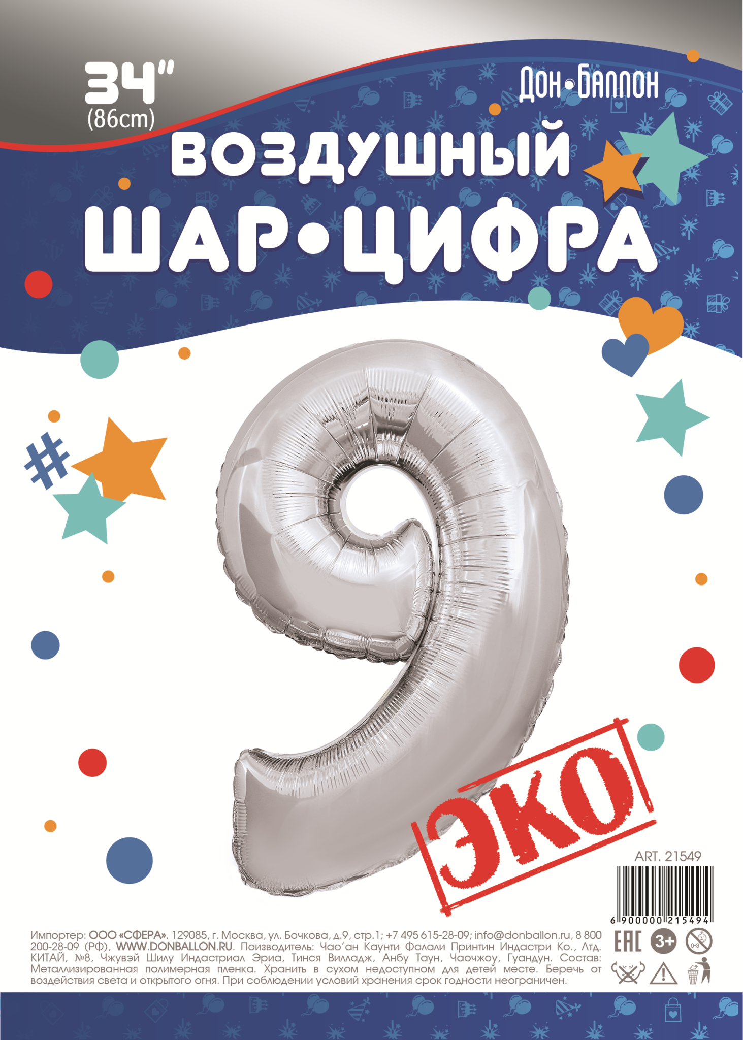 Шар (34''/86 см) Цифра, 9 ЭКО, Серебро, 1 шт. в упак.