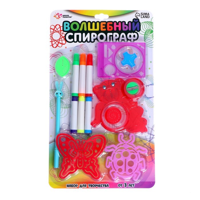 В набор входят 2 спирографа, 2 трафарета, 6 цветных маркеров, ручка, точилка.
