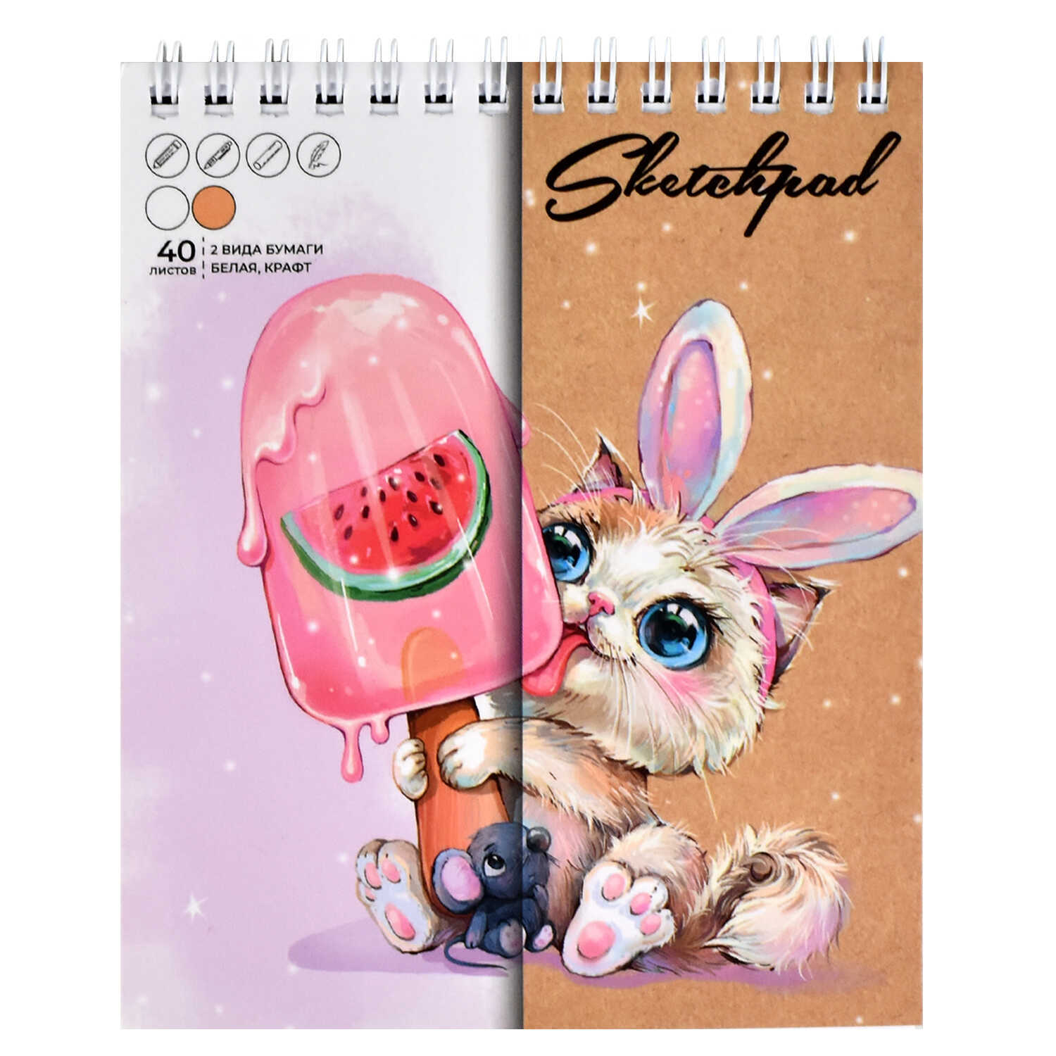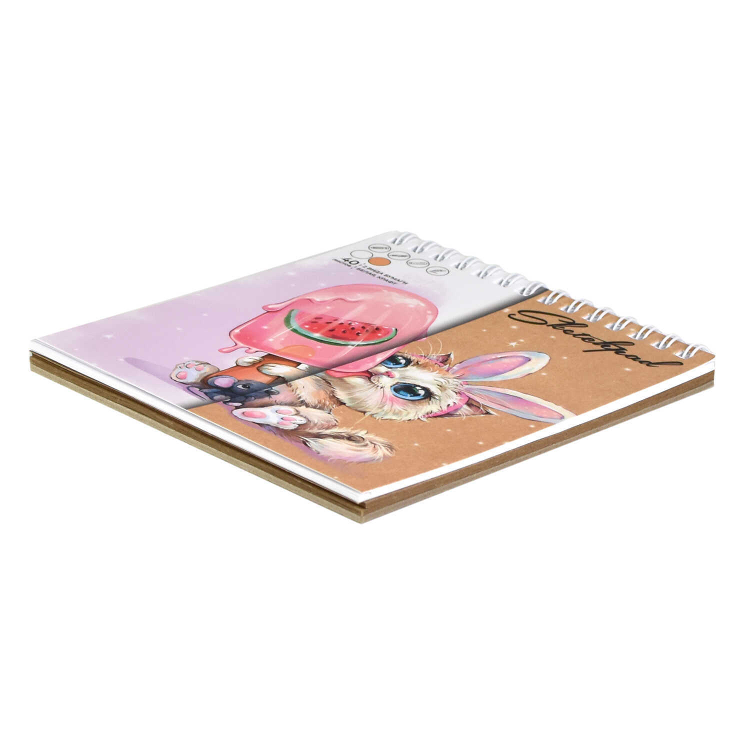 Скетчпад 40 л, гребень по короткой стороне, белый офсет, крафт-бумага, жёсткая подложка из переплётного картона.