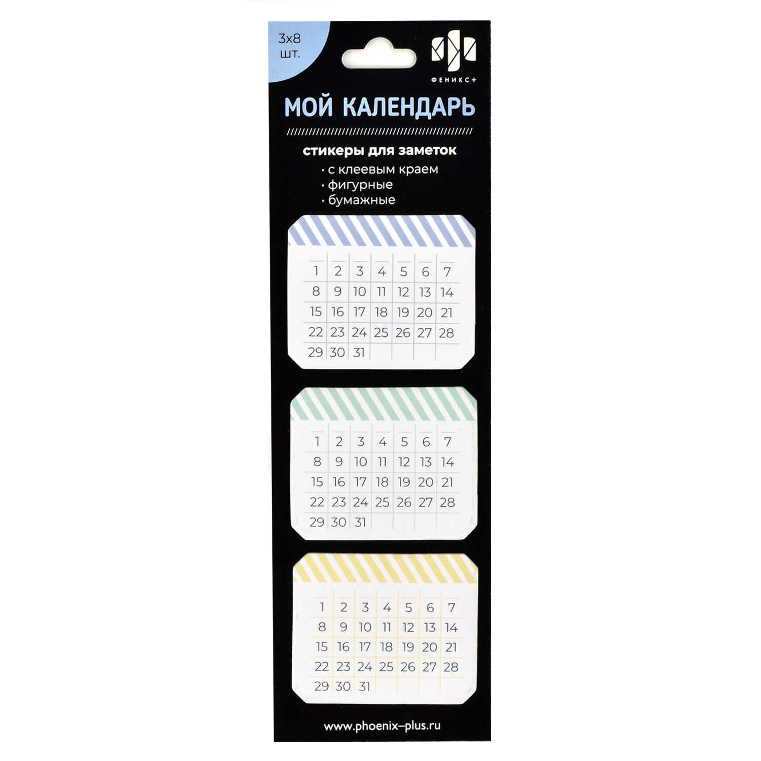 Стикеры-календари бумажные арт. 57606 / 80 МОЙ КАЛЕНДАРЬ (кол-во шт. в наборе: 24, размер 50x40 мм, материал: бумага плотностью 80 г/м², 3 цвет/-а/-ов, форма: фигурная, кол-во каждого цвета: 8 шт., индивидуальная упаковка: подложка с европодвесом из мелованного картона + ПЭТ-пакет)