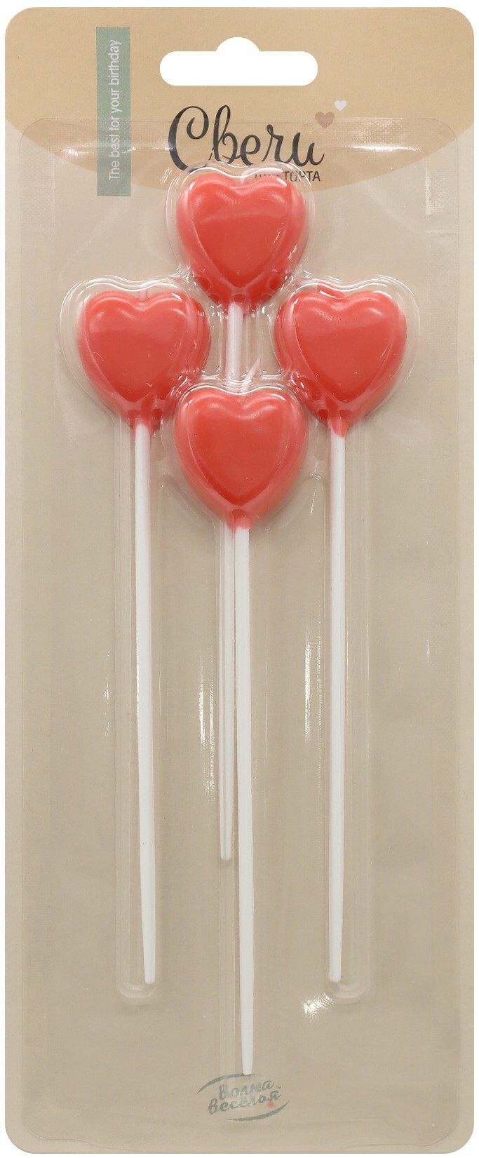 Свечи Сердце, на шпажке, Красный, 2,5*3 см, 4 шт. с держат.