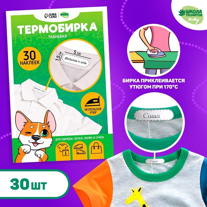 Термобирки для одежды. Набор именных термонаклеек для маркировки детских вещей «Игривый корги», 30 шт
