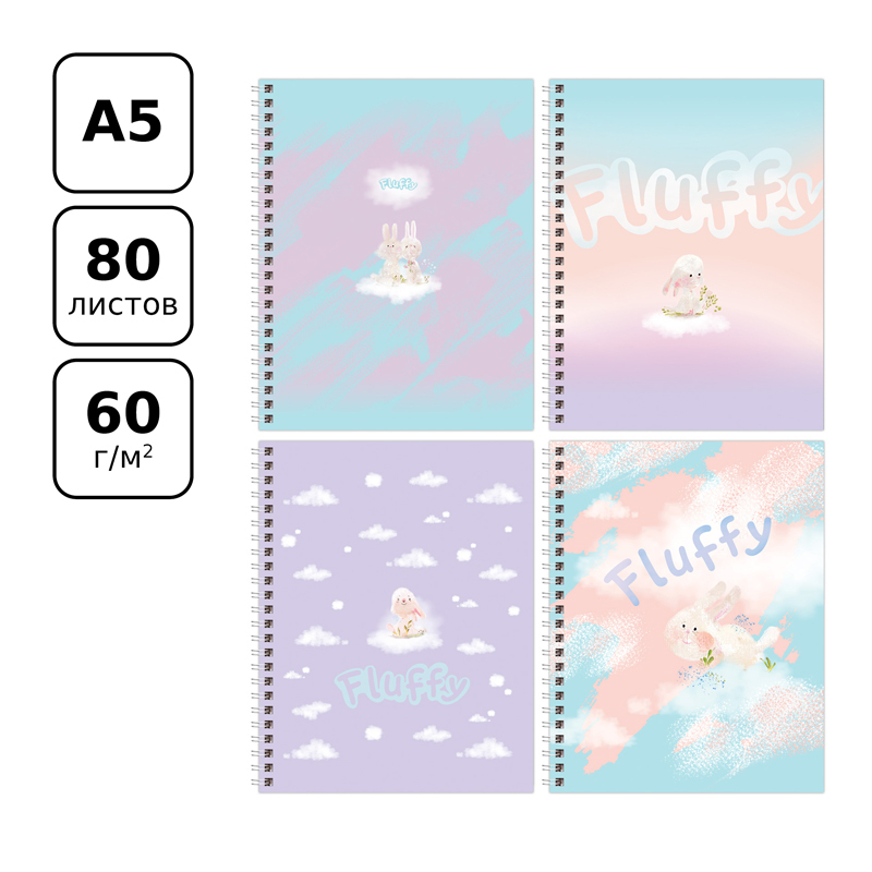Общая тетрадь BG Fluffy формата А5 (165*205мм) на гребне состоит из 80 листов. Внутренний блок – это офсетная бумага плотностью 60 г/м², белизна 100%, линовка – клетка. Обложка выполнена из мелованного картона с матовой ламинацией.
