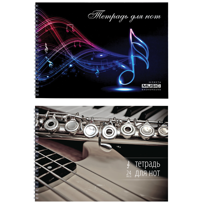 Тетрадь для нот на гребне, горизонтальная ориентация. Верхняя и нижняя обложки тетради выполнены из качественного плотного целлюлозного картона с полноцветной запечаткой. Плотный внутренний блок из бумаги 80г/м2 и 100% белизны повышает комфорт от пользования тетрадью минимизируя просвечивание записей на другой стороне листа.
