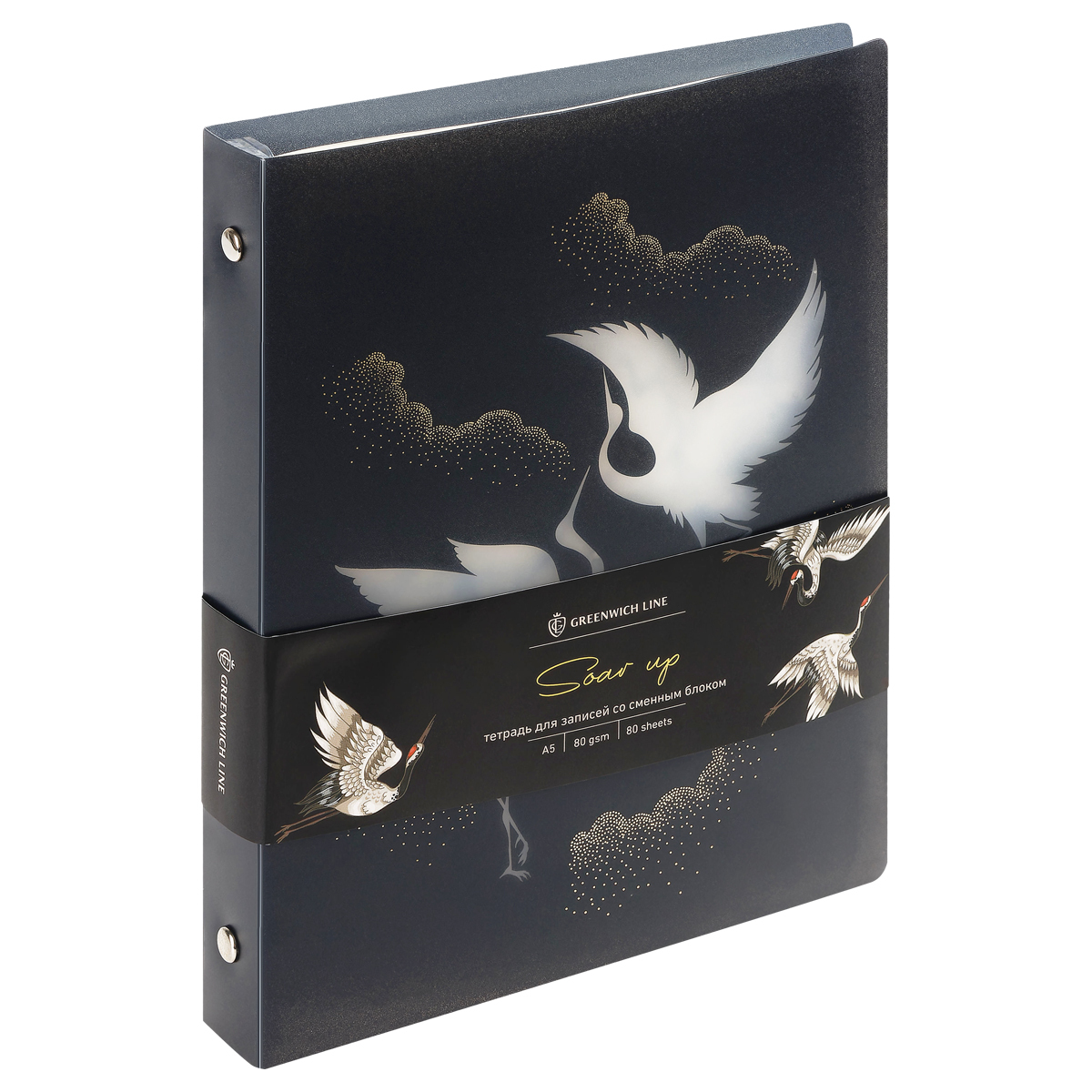 Тетрадь на кольцах Greenwich Line Soar up очень лёгкая, компактная и удобная в применении. Модель отличает прочная пластиковая обложка с рисунком японских журавлей на чёрном фоне и титульный лист из плотной бумаги, повторяющий дизайн обложки. Тетрадь формата А5 (180*215 мм) с 20 мини-кольцами дополнена прозрачным механизмом для лёгкой смены блоков. При открывании фиксатора внизу, кольца раскроются. После замены листов верните его в исходное положение до лёгкого щелчка. Принцип открывания смотрится эффектно, а маленькие кольца не мешают при письме.