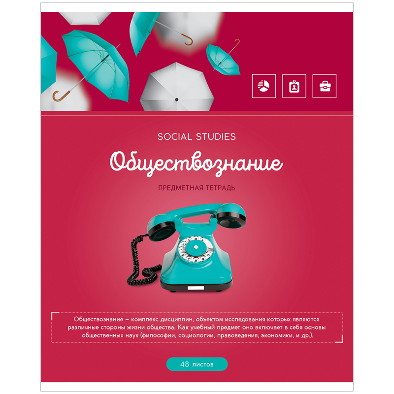 Тетрадь тематическая «Обществознание» из серии «Полет мысли» (в серии 12 предметов), со справочным материалом на обложке. Формат А5 (165*205 мм). Вид крепления – скрепка. Внутренний блок – 48 листов, офсет 60 г/м?, линовка – клетка с полями. Обложка – целлюлозный картон, отделка обложки – ВД-лак