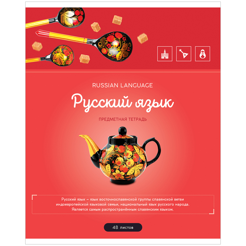 Тетрадь тематическая «Русский язык» из серии «Полет мысли» (в серии 12 предметов), со справочным материалом на обложке. Формат А5 (165*205 мм). Вид крепления – скрепка. Внутренний блок – 48 листов, офсет 60 г/м?, линовка – линия с полями. Обложка – целлюлозный картон, отделка обложки – ВД-лак