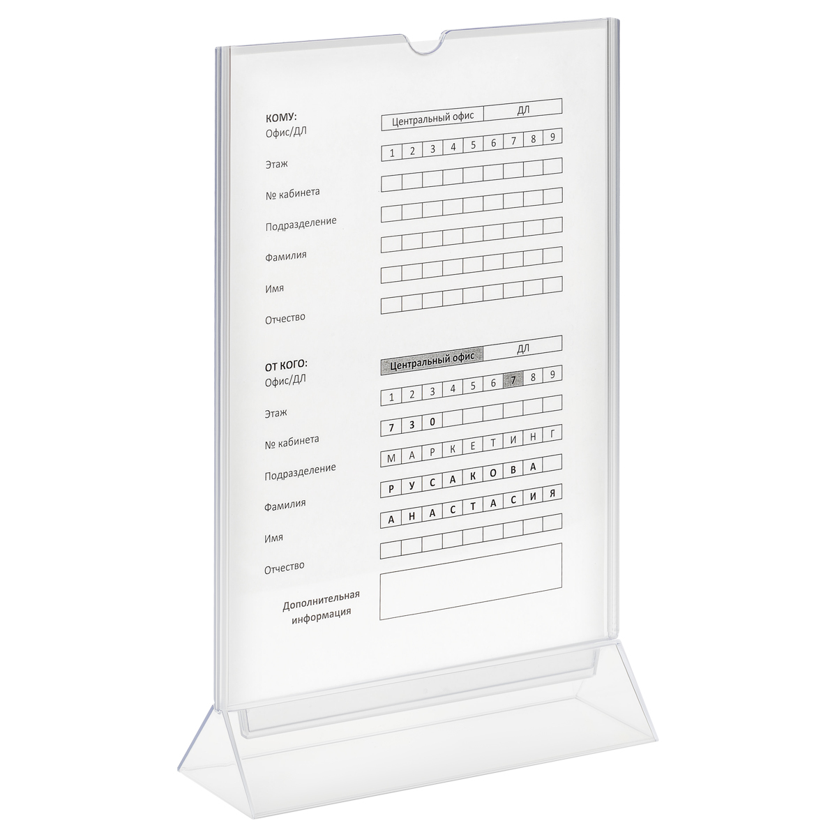 Двусторонняя подставка для информации, рекламы, меню размером – универсальное решение для разных сфер бизнеса. Изделие имеет формат А4 и выполнено из акрила. Материал полностью прозрачен, не мутнеет со временем. Ориентация – вертикальная.