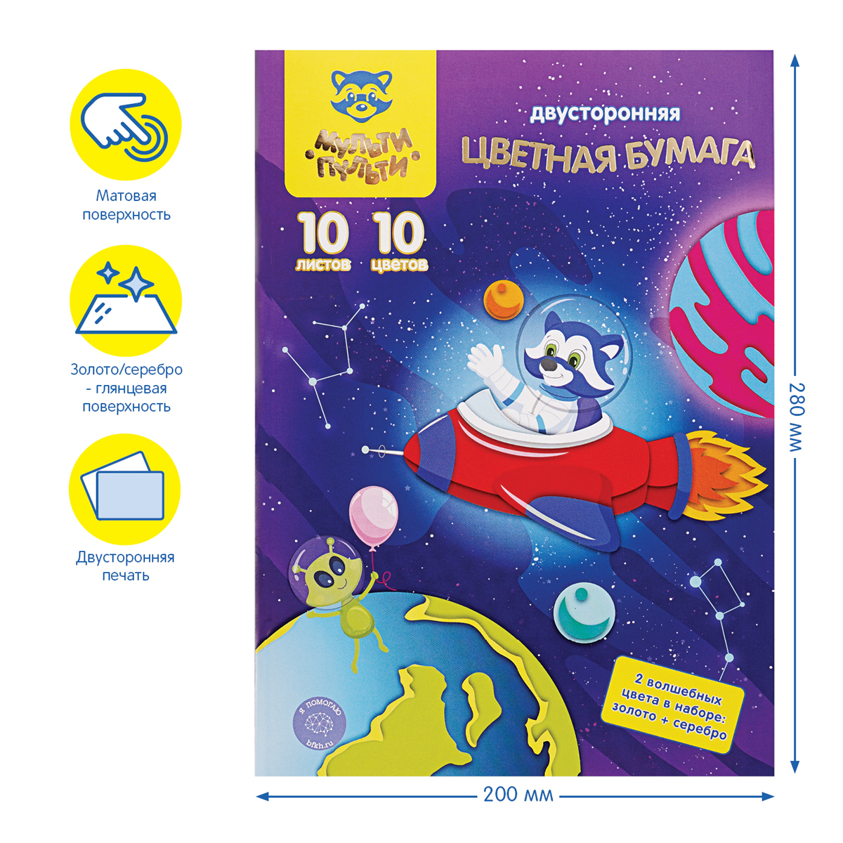 Набор цветной двусторонней офсетной бумаги «Мульти-Пульти» серии «Енот в космосе. Волшебная» замечательно подойдет для творчества. Бумага имеет размер 200*280 мм. Плотность бумаги формата А4 – 65 г/м2. В наборе представлено 10 цветов офсетной цветной бумаги на 10 листах, в том числе два листа серебряного и золотого цвета, что позволит создавать волшебные фантазийные поделки.