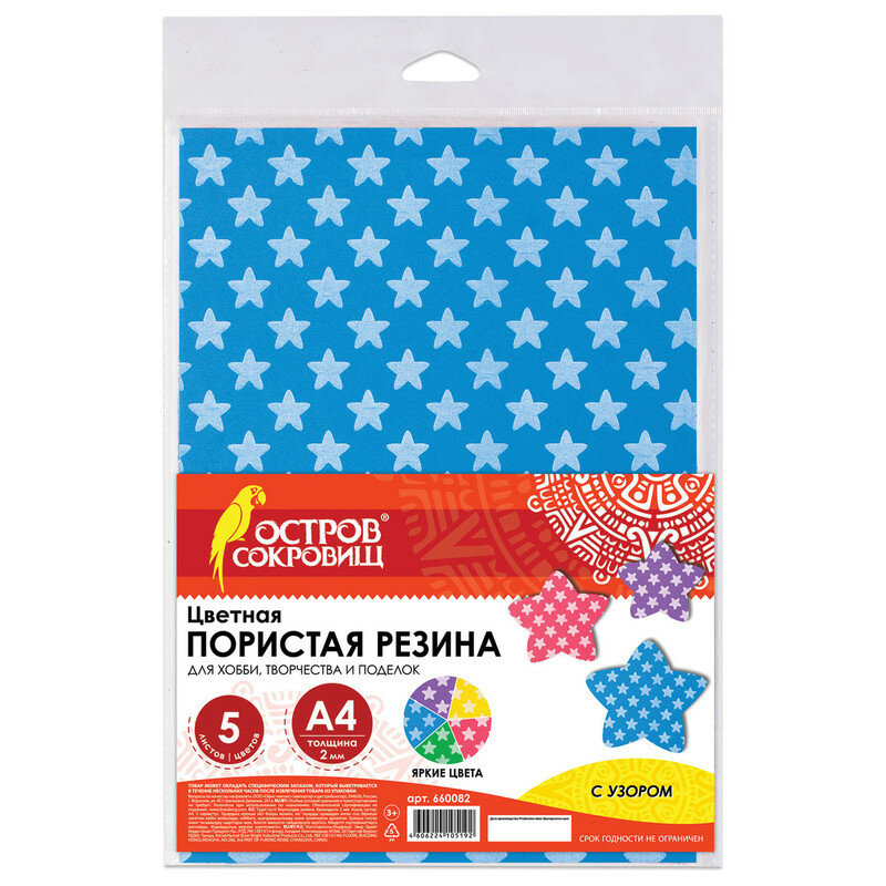 Цветная пористая резина (фоамиран) ОСТРОВ СОКРОВИЩ предназначена для хобби, творчества и рукоделия.В набор входит 5 цветов c узором, которые позволят создать уникальную и эффектную поделку! Листы формата А4 (21х29,7 см) толщиной 2 мм удобны для создания украшений из фоамирана, создания аппликаций, декорирования различных предметов и изделий. Яркие цвета с узором помогут выгодно выделить Вашу поделку, а их насыщенность не оставит никого равнодушным.Используется для создания флористического декора, аппликаций, сувениров, детского рукоделия и создания украшений. Готовые изделия представляют собой: аксессуары для волос (банты, ободки, резинки, короны), бижутерию, банты для подарочных упаковок, елочные игрушки. Не токсична, безопасна для детского творчества.Цветная пористая резина с узором ОСТРОВ СОКРОВИЩ - блестящий материал для воплощения Ваших творческих идей!