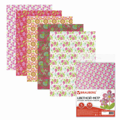 Цветной фетр ОСТРОВ СОКРОВИЩ предназначен для создания ярких творческих поделок дома, в школе и в детском саду. Используется для создания аппликаций и вышивания, легко режется и приклеивается на ровную поверхность.Плотность - 170 г/м2 и толщина в 2 мм гарантируют поделкам отличное качество и долгий срок службы. Цветной фетр формата А4 поставляется в упаковке по 5 листов, 5 насыщенных цветов, с различными цветочными рисунками. Такое многообразие оттенков придется по вкусу любому покупателю. Фетр Остров Сокровищ обладает приятной нежной фактурой, прост и удобен в использовании. Края не осыпаются при разрезании, благодаря чему не нуждаются в дополнительной обработке.