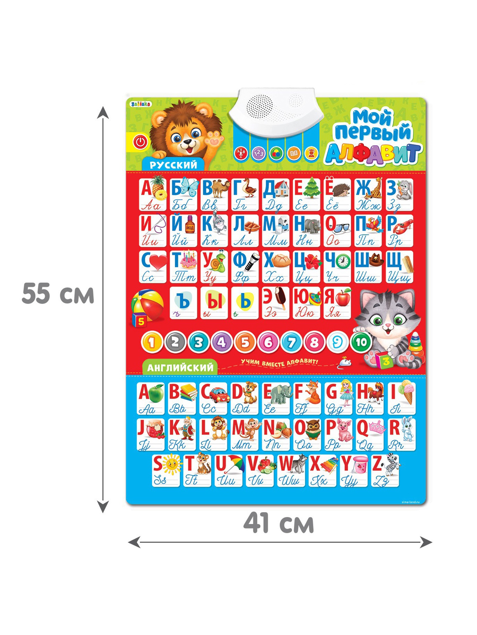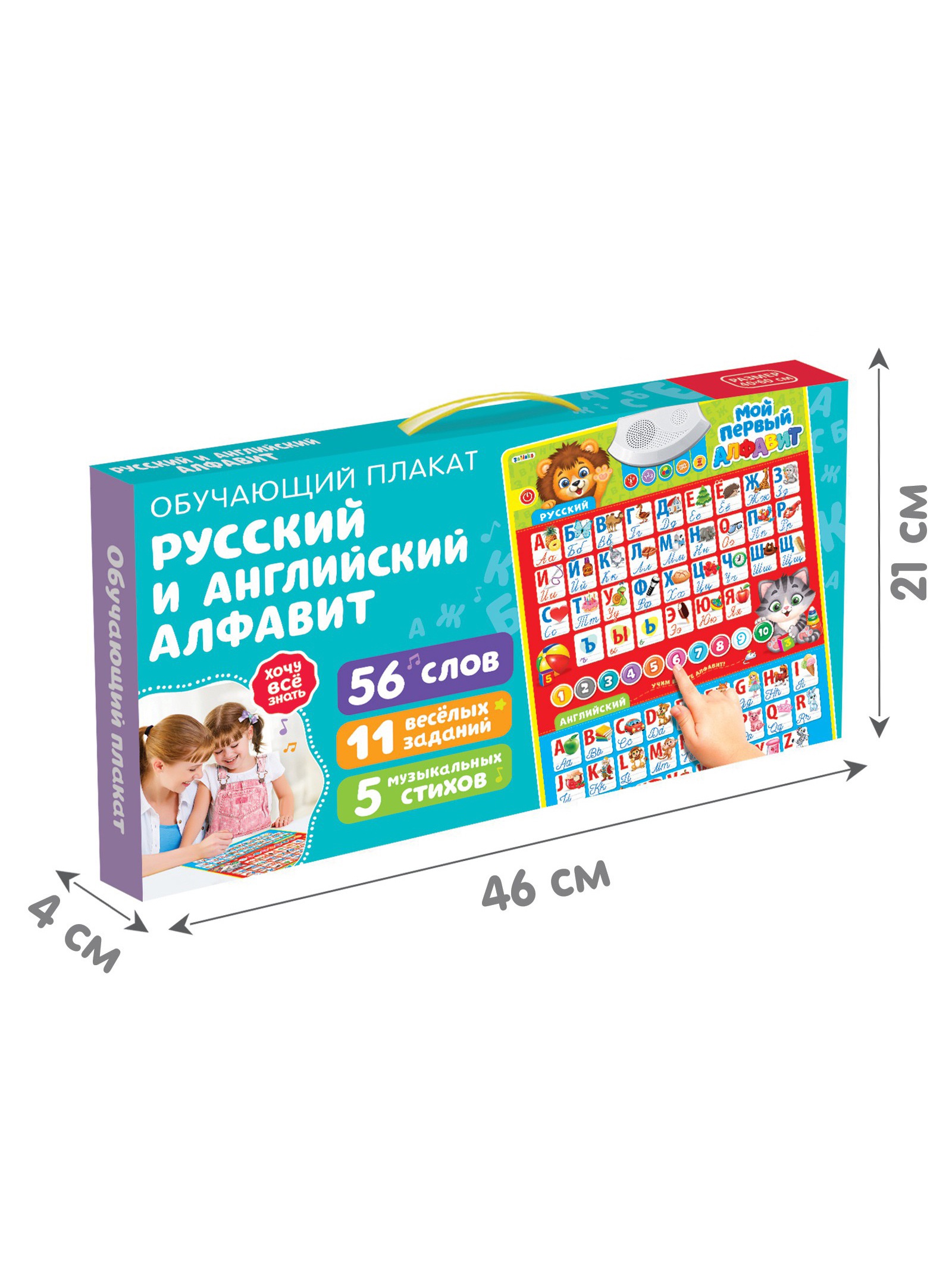 Обучающий плакат «Русский и английский алфавит» позволит ребёнку выучить буквы, цифры и цвета сразу на двух языках.