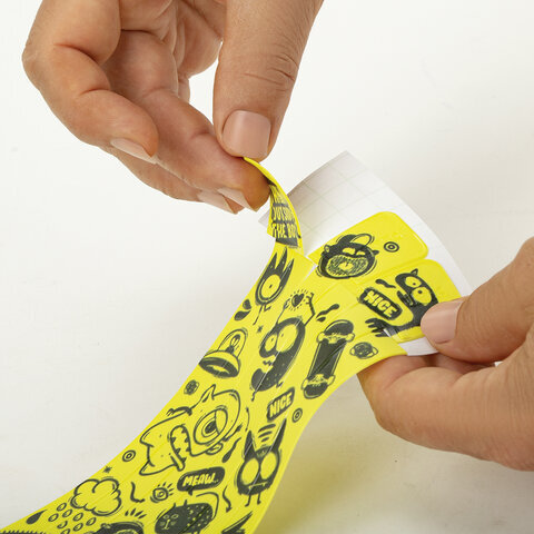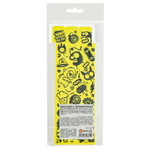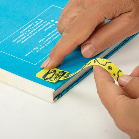 Закладка пластиковая. Основание закладки имеет липкую сторону, которую нужно приклеить на заднюю часть обложки книги и плотно прижать. Длина каждой закладки – 376 мм. Специальная длина для рабочих тетрадей формата А4. Если нужна закладка короче, можно просто отрезать изделие до нужной длины.