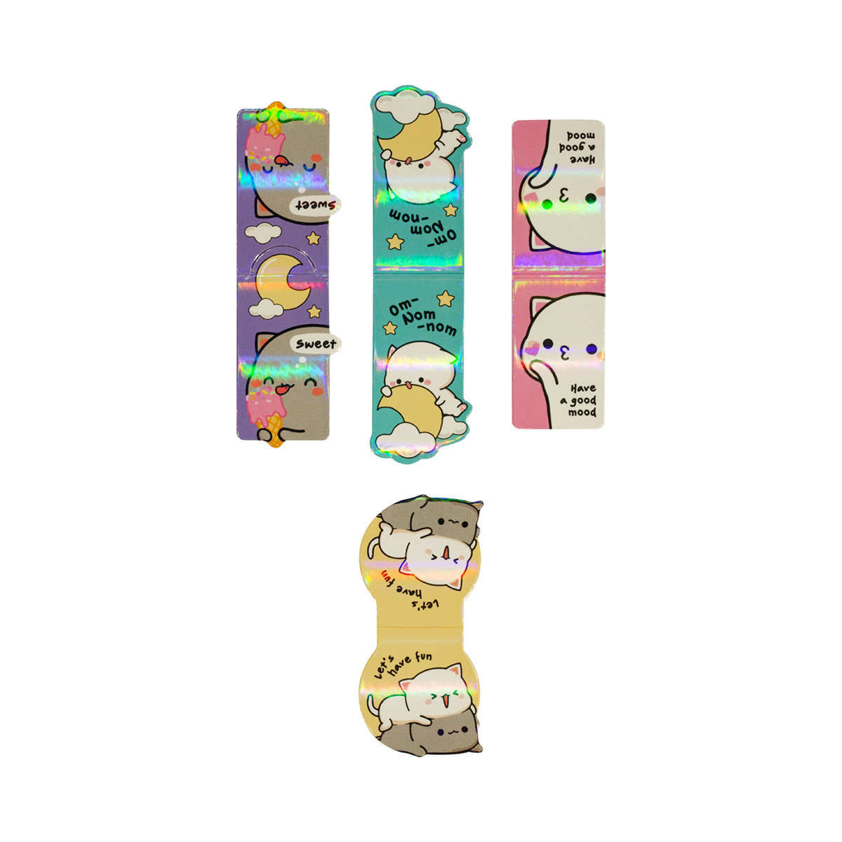 Благодаря полностью магнитному основанию закладки надёжно фиксируются на страницах и не выпадают, даже если перевернуть книгу. Аксессуары сделаны из полимерных материалов. В отделке используется ламинация с блёстками.